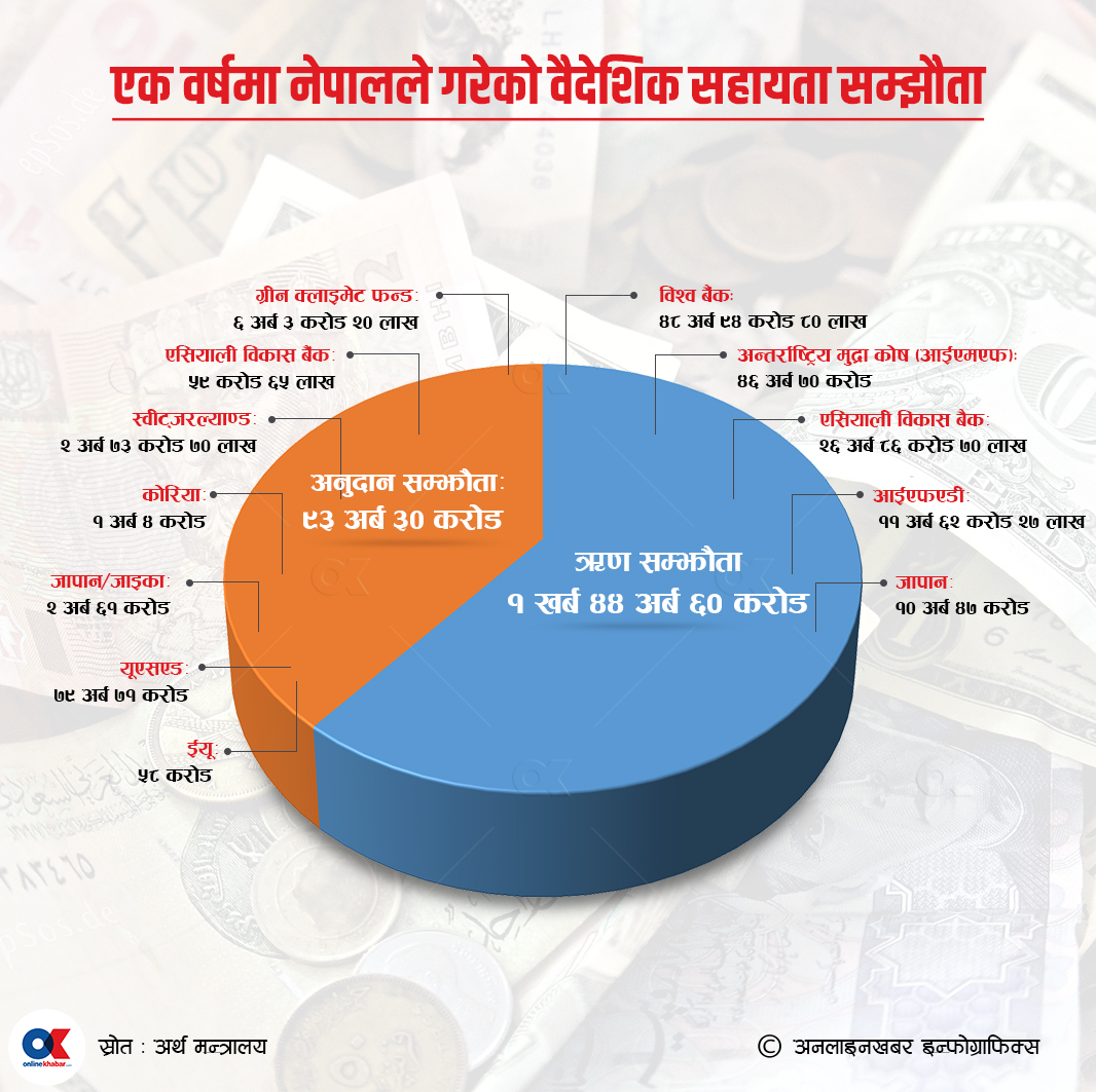 २५ साउन, काठमाडौं । नेपालले एक वर्षको अवधिमा २ खर्ब ३८ अर्ब रुपैयाँ बराबरको वैदेशिक सहायता प्राप्त गर्ने गरी दातृ–निकायसँग सम्झौता गरेको छ ।