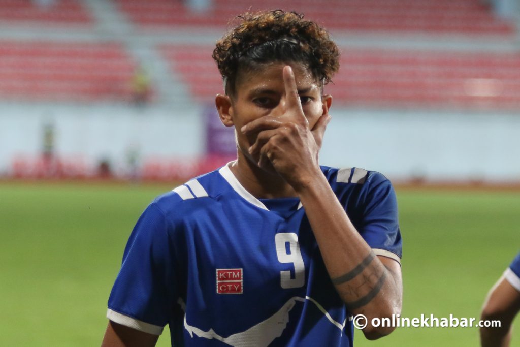 भुटानलाई ४-० ले हराएको खेलमा गोल गरेपछि खुसी मनाउँदै सावित्रा ।