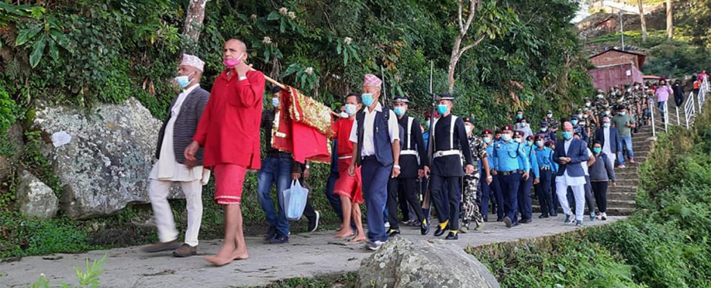 काठमाडौंको बसन्तपुरमा गोरखाबाट फूलपाती ल्याइँदै