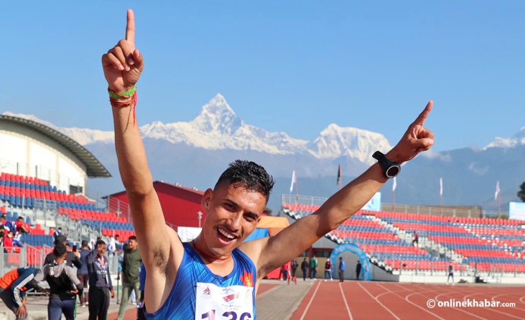 दौडमा पहिलो भएपछि दीपक अधिकारी । तस्वीर : सुदर्शन रञ्जित/अनलाइनखबर